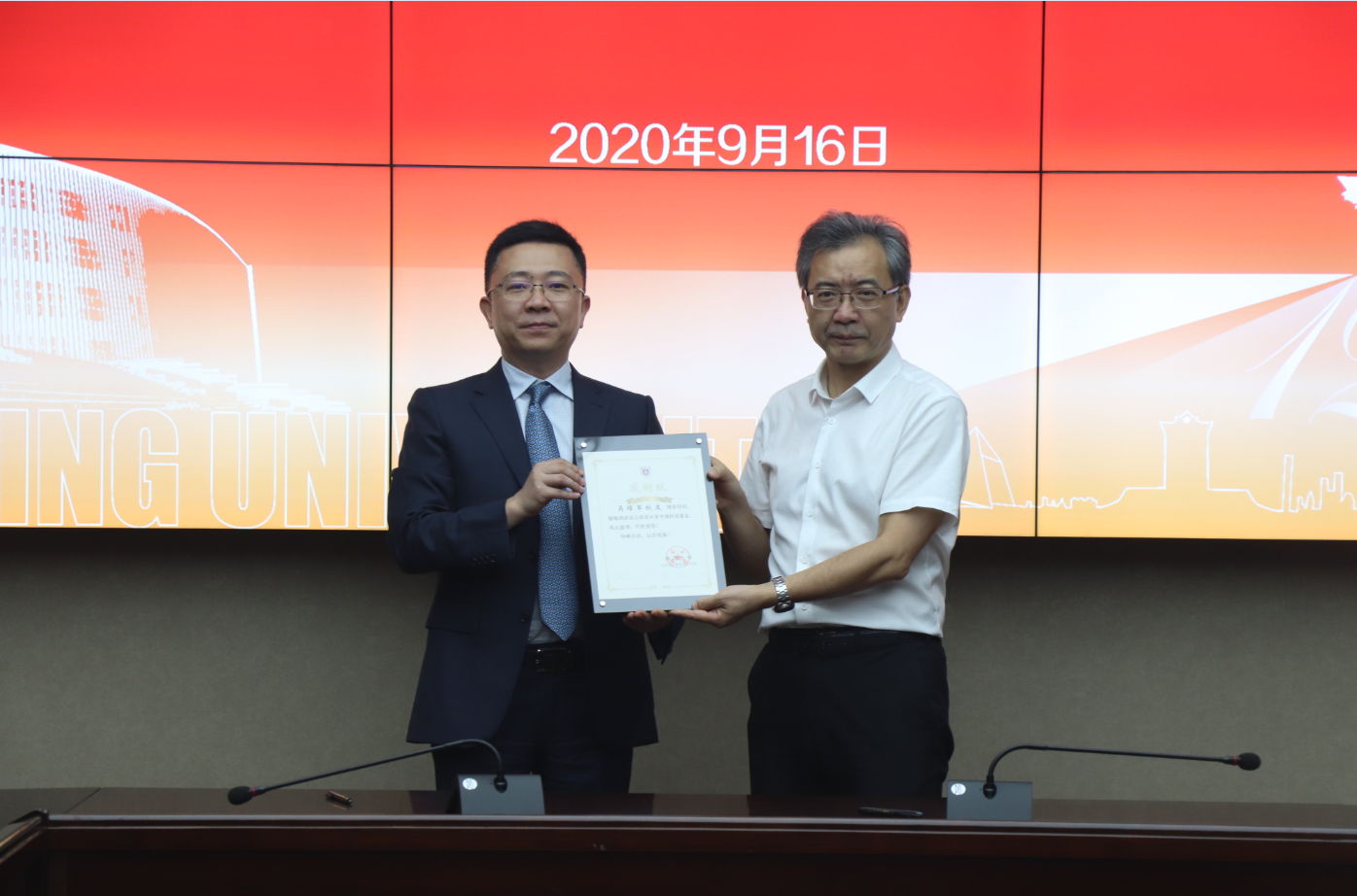 儀式上,吳董代表中旗科技向南京大學捐贈1000萬元,設立南京大學中旗科技基金,該基金用于南京大學化學化工學院頂尖領軍人才項目、卓越青年學者項目、獎學獎教金項目以及百年院慶相關項目。南京大學教育發展基金會秘書長張曉東代表學校接受了捐贈,南京大學黨委常委、常務副校長談哲敏頒發了感謝狀。