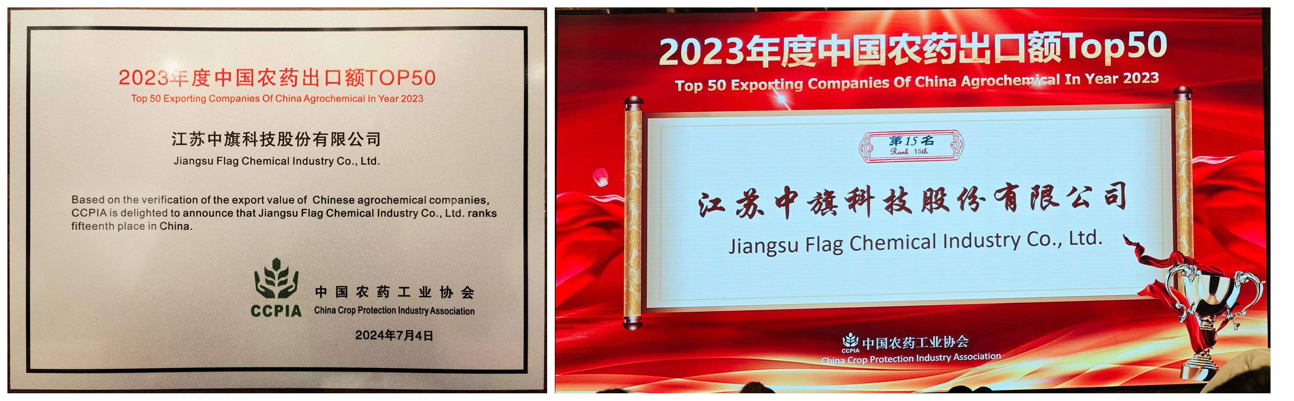 2024年7月4日,在“第十一屆中國植物保護產(chǎn)品國際貿(mào)易發(fā)展論壇”上,中國農(nóng)藥工業(yè)協(xié)會發(fā)布2023年度“中國農(nóng)藥出口額Top50”榜單,中旗科技榮獲該榜單第15名。